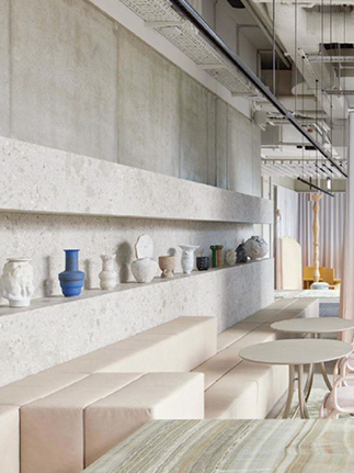 Individuell gefertigte Möbel, maßgearbeitete Steinverkleidungen und lose Möblierung wurden speziell für dieses Projekt entwickelt, gefertigt und montiert.